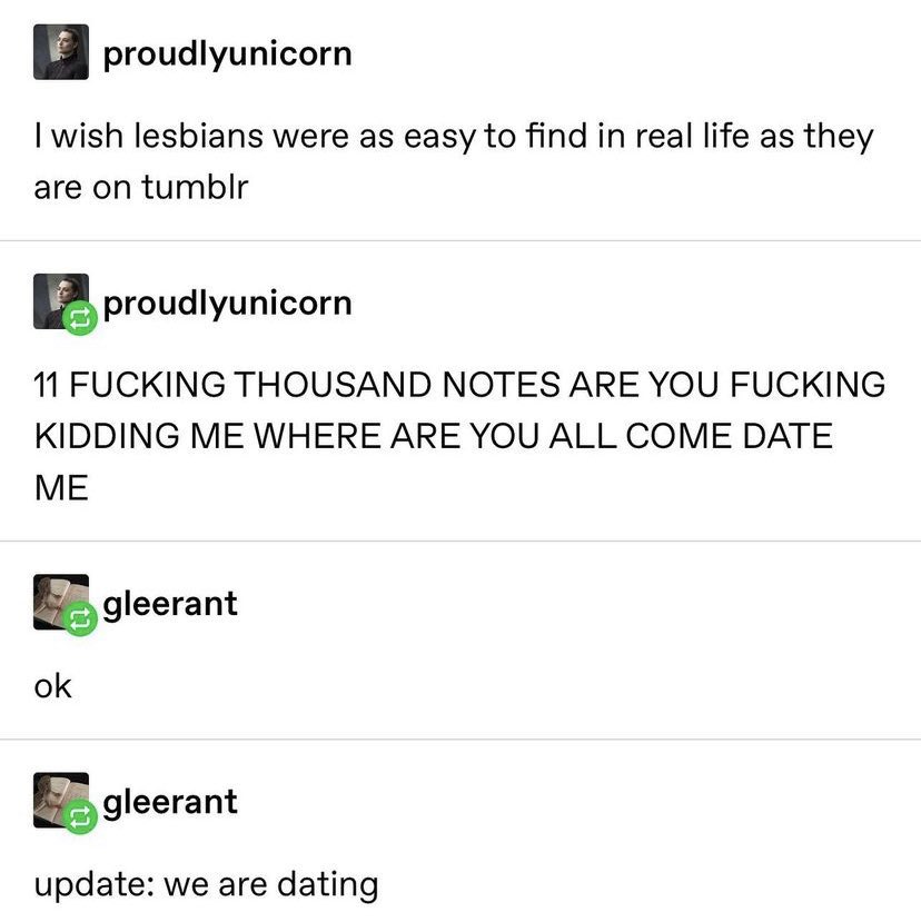 I wish lesbians were as easy to find in real life as they are on tumblr. 11 FUCKING THOUSAND NOTES ARE YOU FUCKING. 11 FUCKING THOUSAND NOTES ARE YOU FUCKING.
